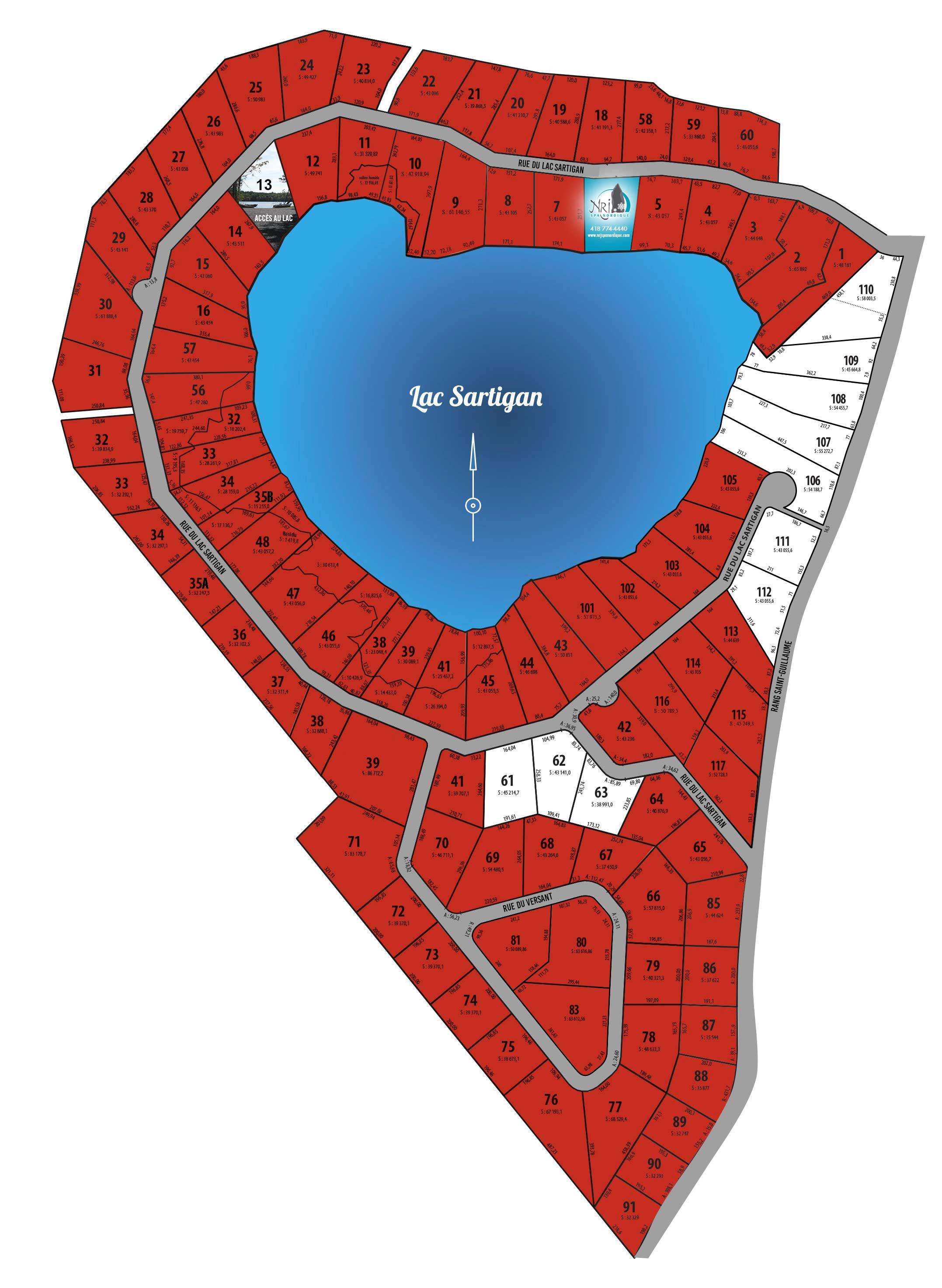 La superficie des terrains varie entre 33 000 p² et 87 000 p². Les terrains sont conçus de manière à ce que chaque maison bénéficie d’une intimité garantie. Plusieurs terrains sont au bord de l’eau, les autres lots ont accès aux lac via le terrain numéro 13. Des règles strictes sont à suivre pour limiter le déboisement, et assurer la qualité architecturale des constructions.